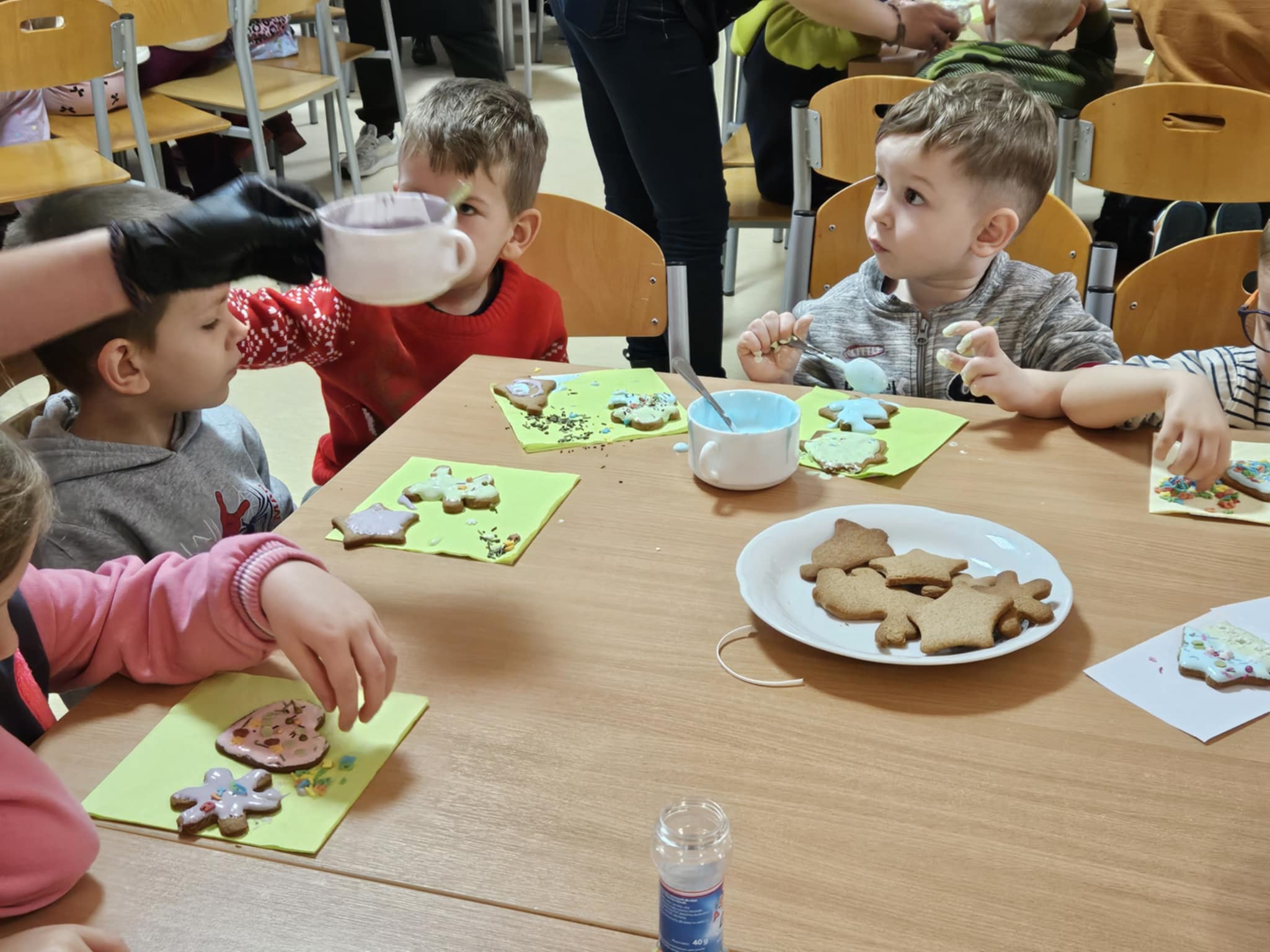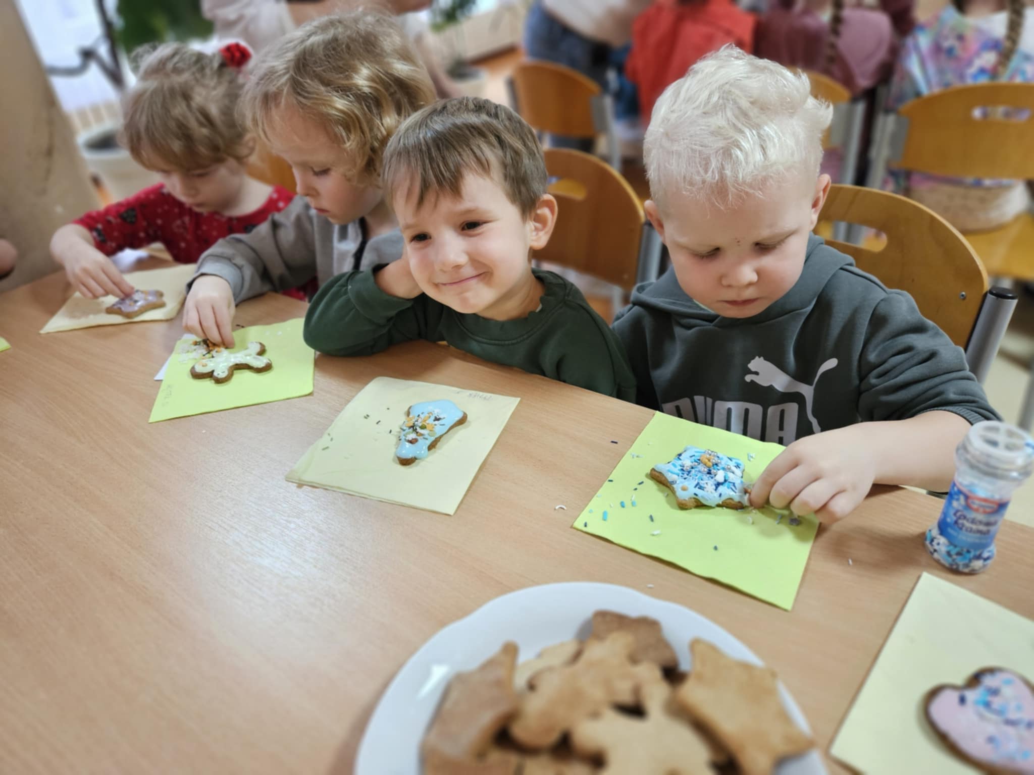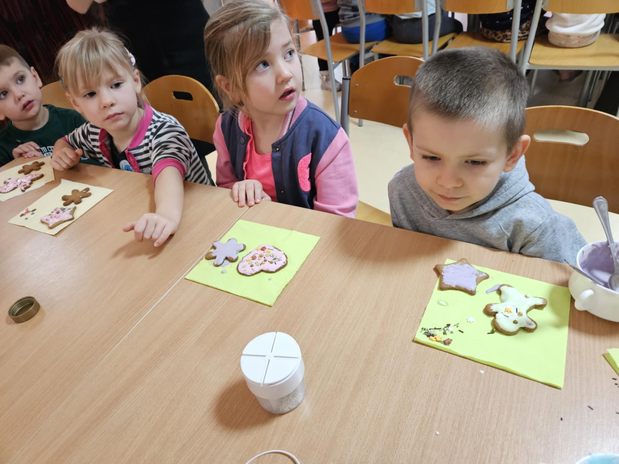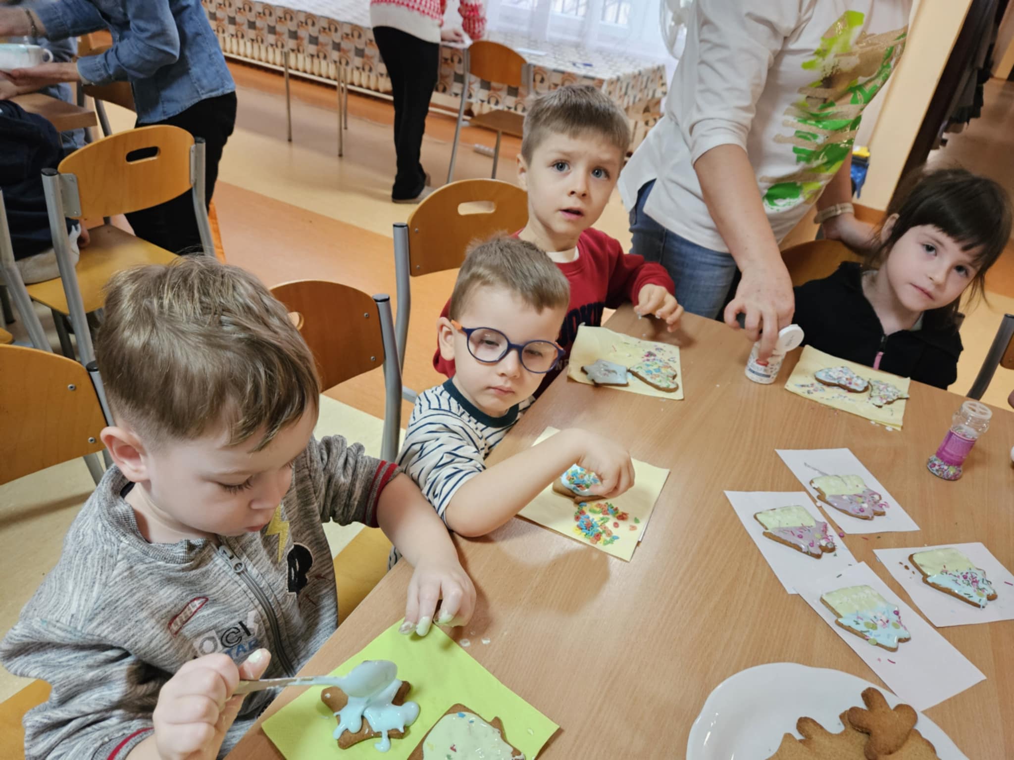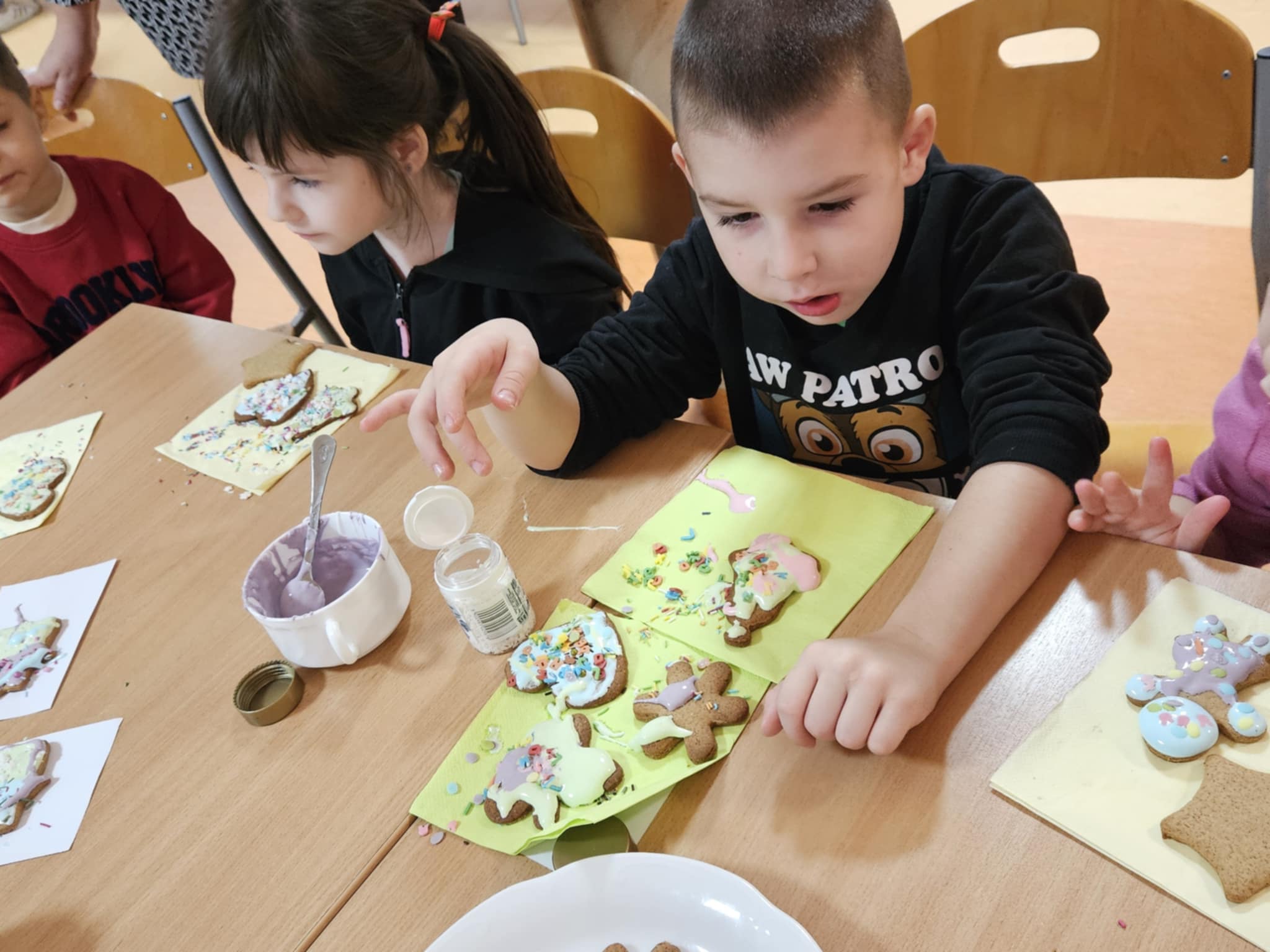 Podczas zajęć dzieci z ogromnym zaangażowaniem ozdabiały pierniki kolorowymi lukrami i posypkami, tworząc prawdziwe małe dzieła sztuki. Dzieciom podobały się te kreatywne zajęcia, a nawet bardzo im posmakowały... :)