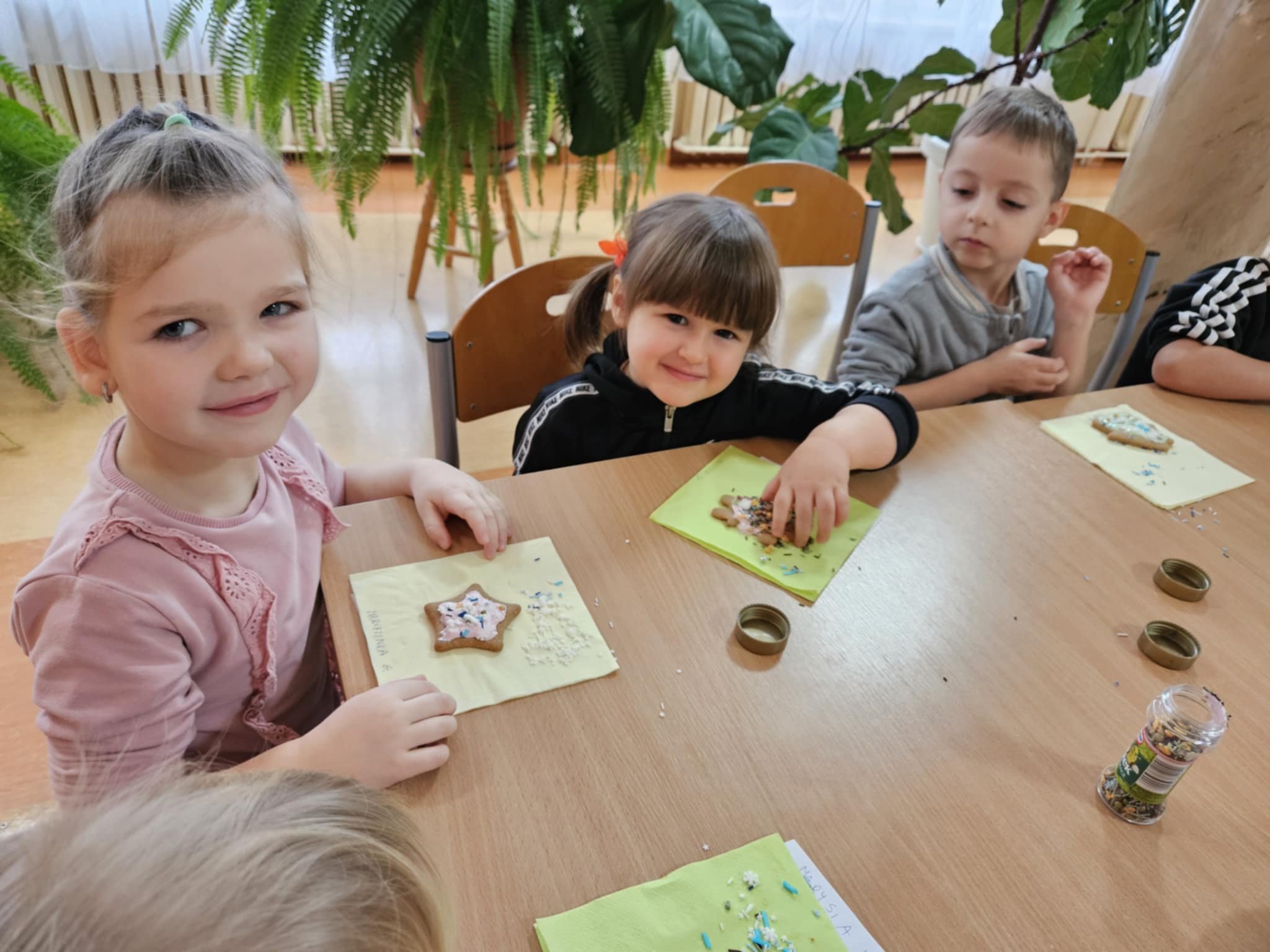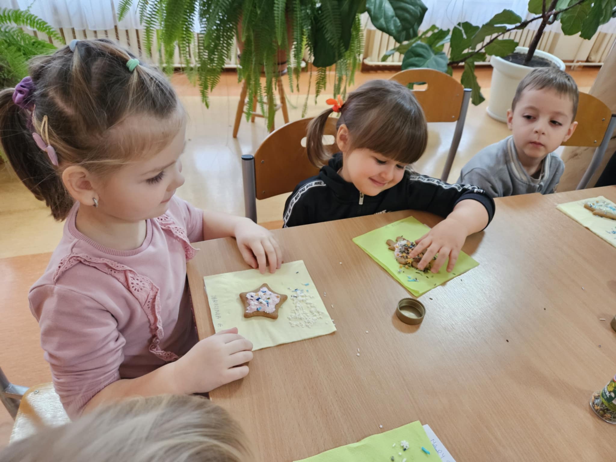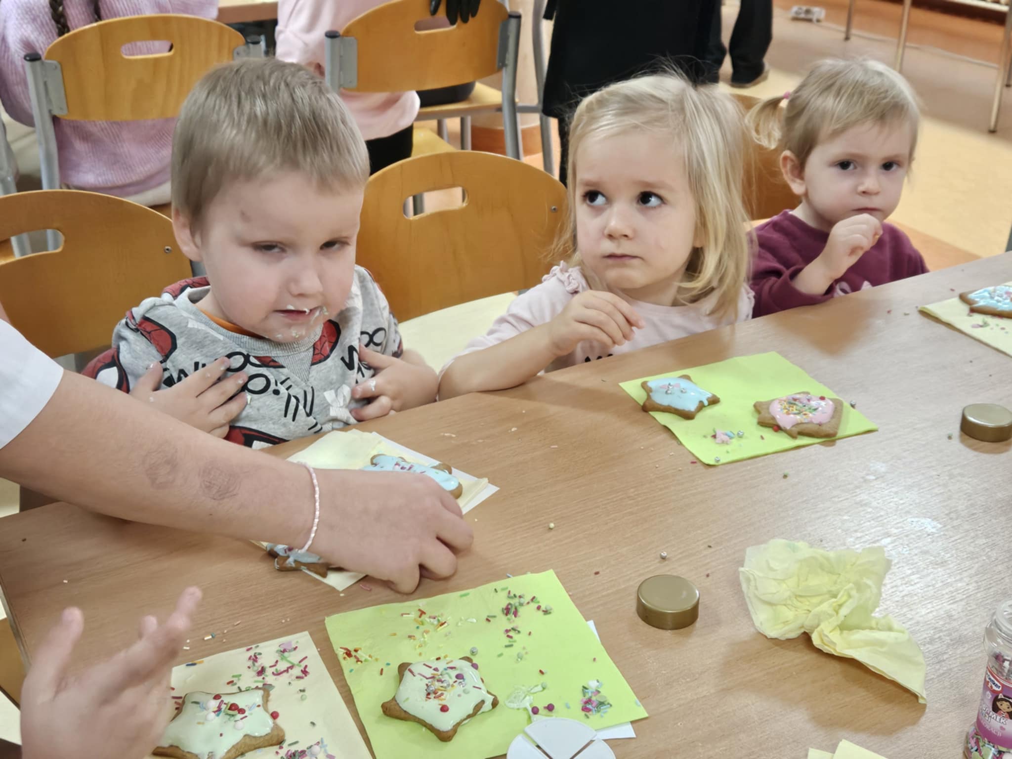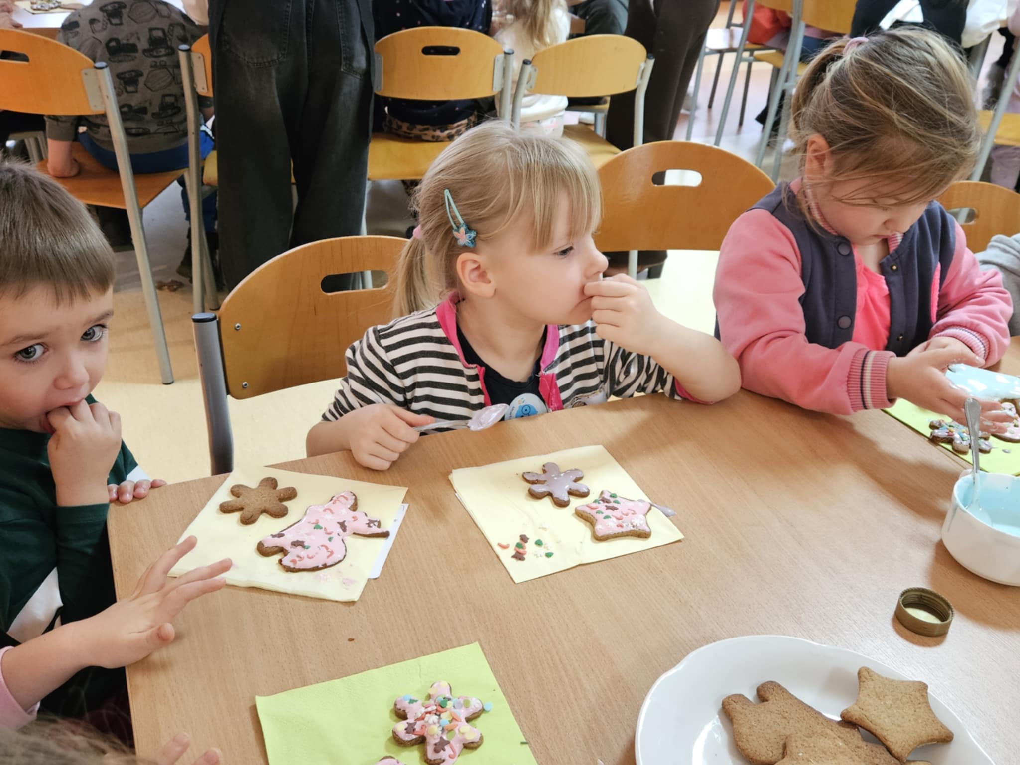 Podczas zajęć dzieci z ogromnym zaangażowaniem ozdabiały pierniki kolorowymi lukrami i posypkami, tworząc prawdziwe małe dzieła sztuki. Dzieciom podobały się te kreatywne zajęcia, a nawet bardzo im posmakowały... :)