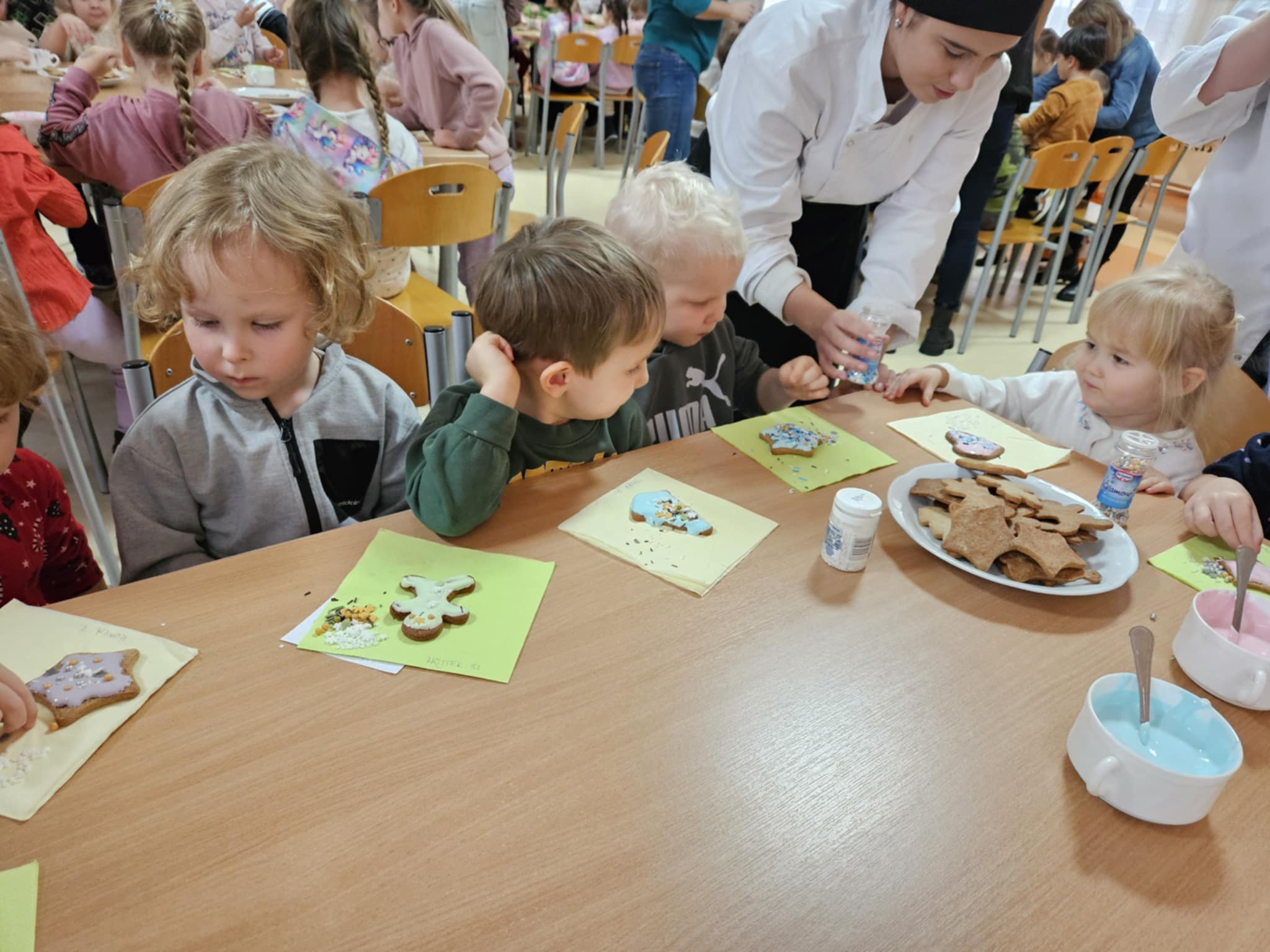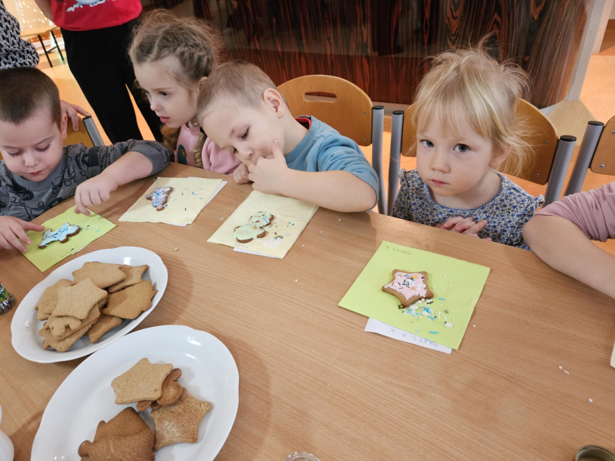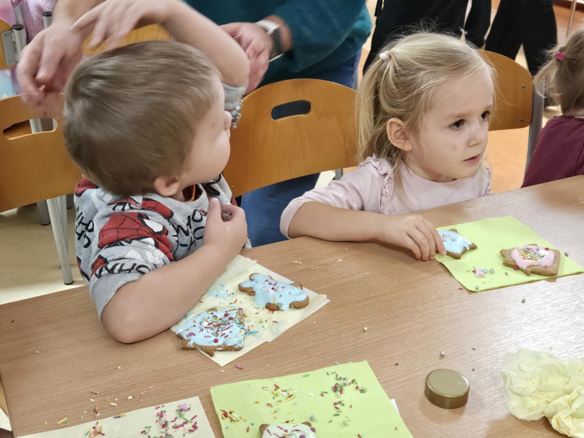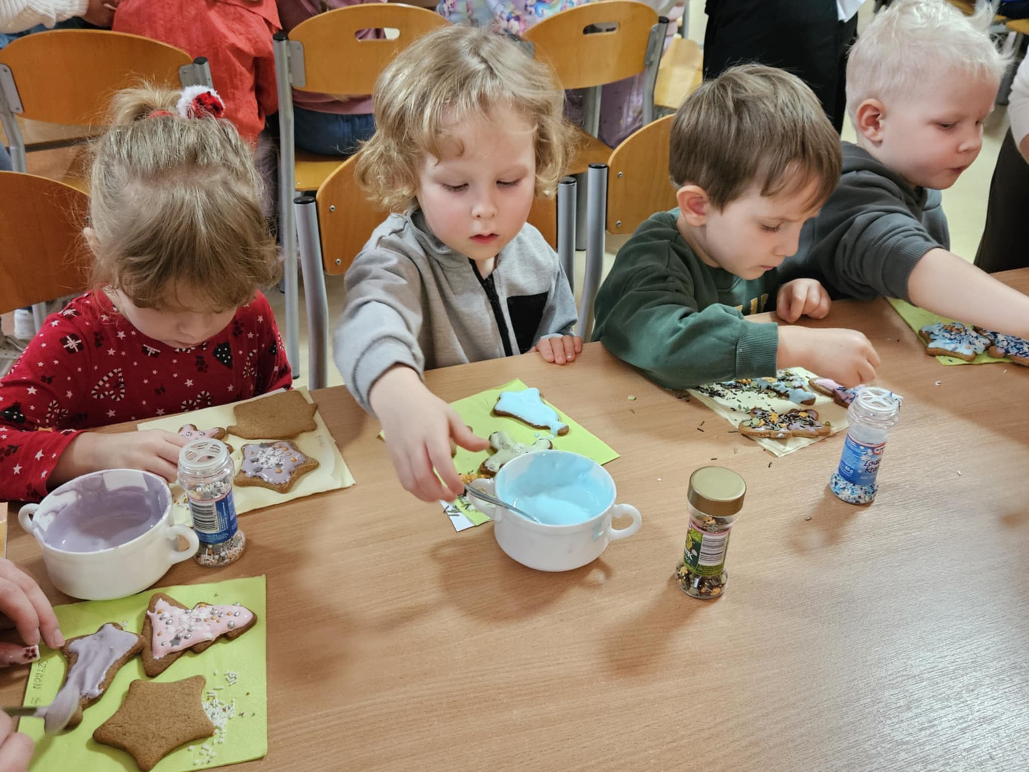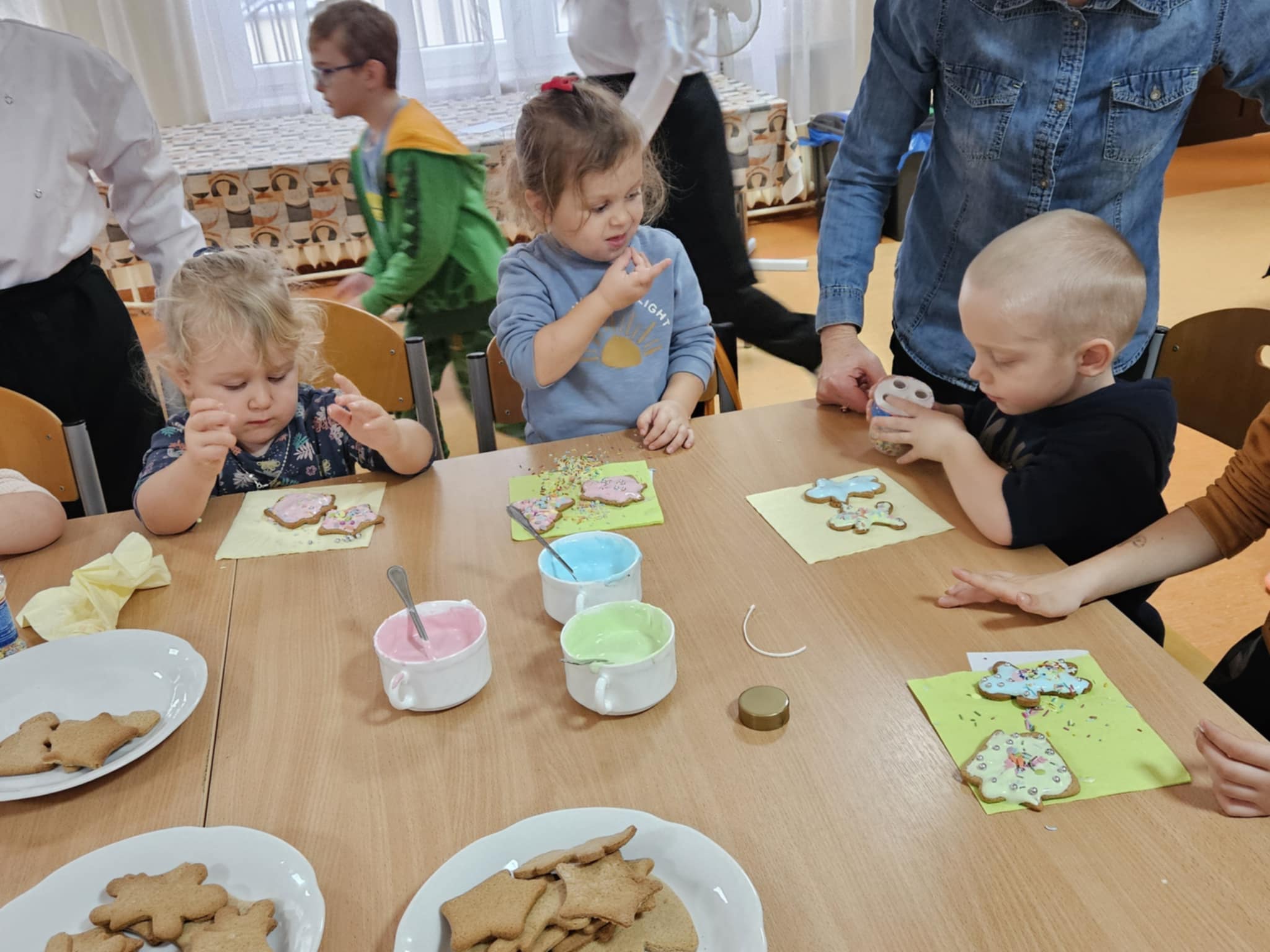 Podczas zajęć dzieci z ogromnym zaangażowaniem ozdabiały pierniki kolorowymi lukrami i posypkami, tworząc prawdziwe małe dzieła sztuki. Dzieciom podobały się te kreatywne zajęcia, a nawet bardzo im posmakowały... :)